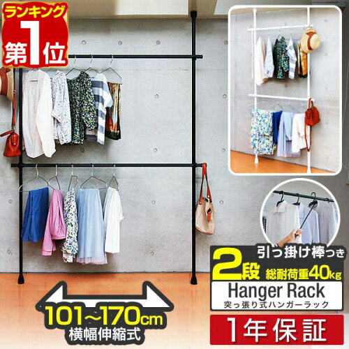 1年保証 突っ張り ハンガーラック 2段 最大幅172cm 高さ219〜278cm 大容量 つっぱり ハンガー 突っ張り棒 ラック パイプハンガー ポールハンガー 頑丈 洋服掛け 衣類収納 クローゼットハンガー 省スペース 壁面収納 天井つっぱり式 ■[送料無料][あす楽]